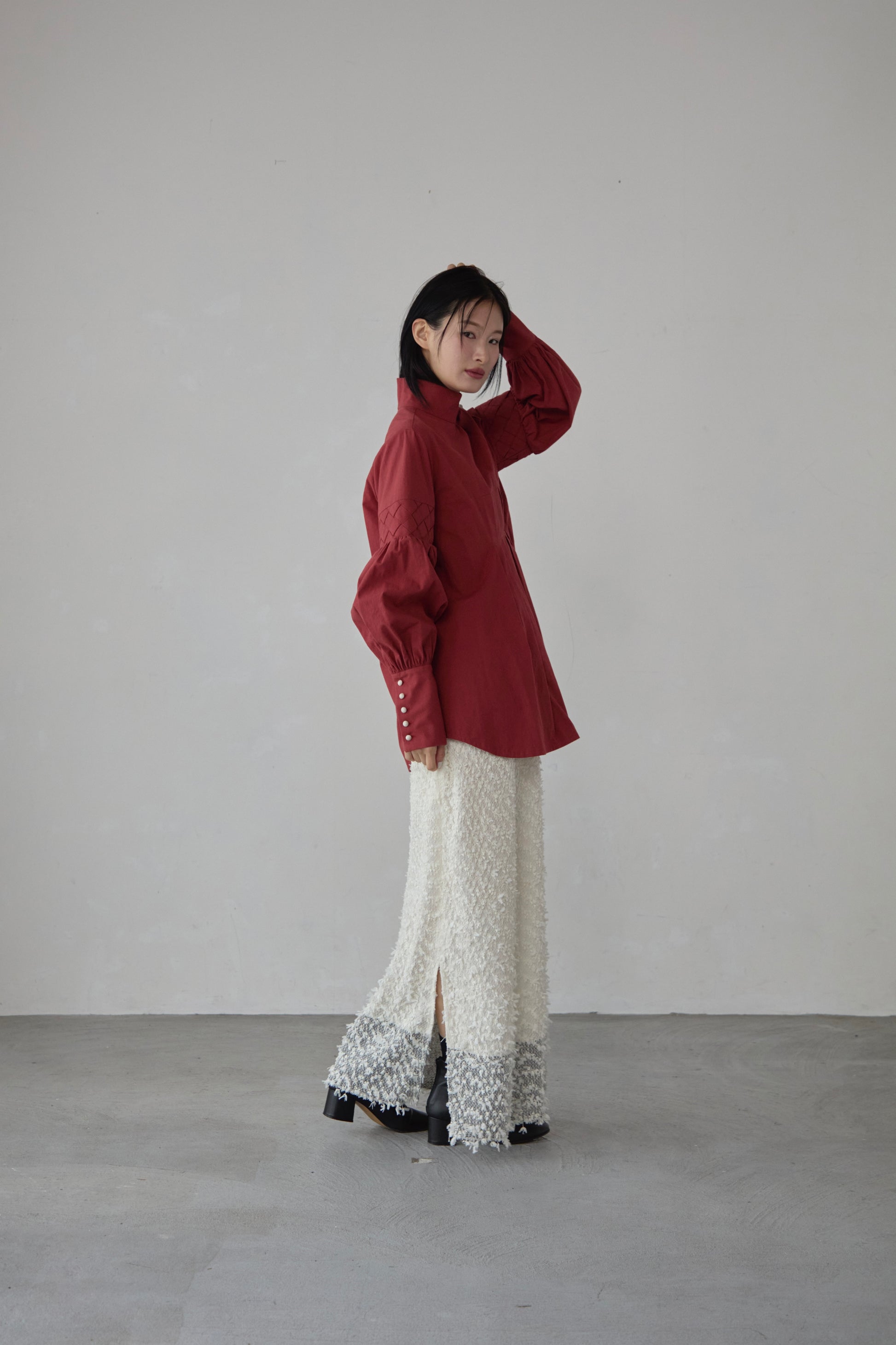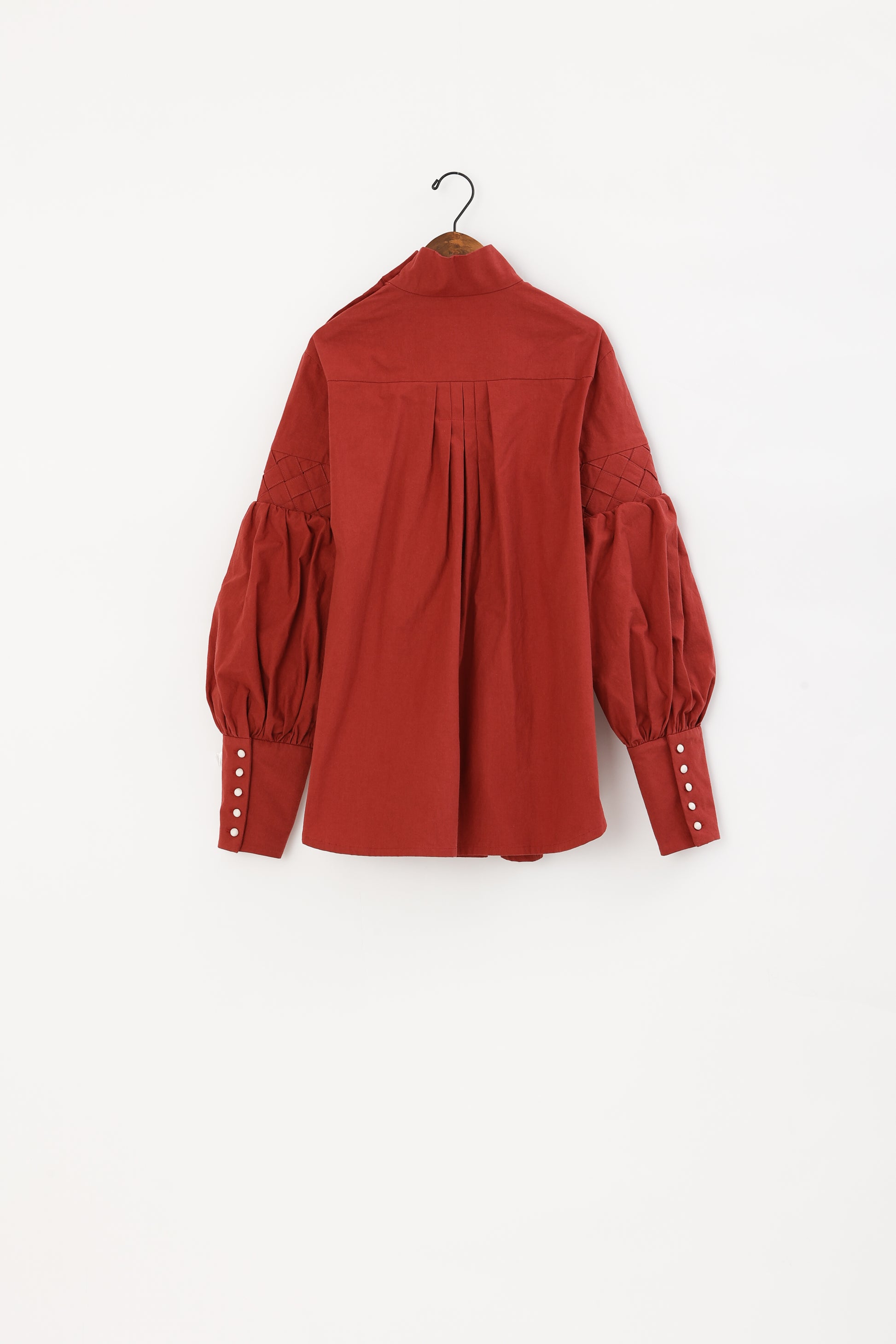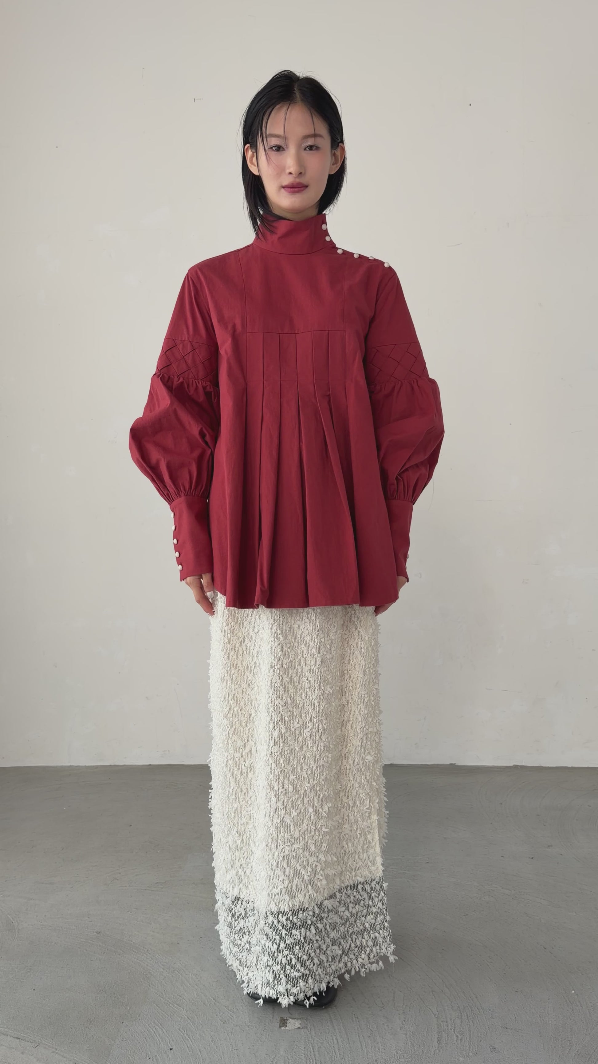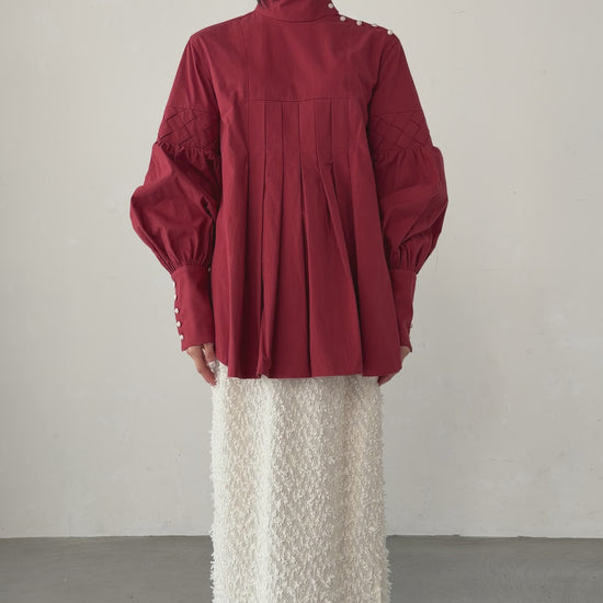 深みのある色彩と、建築的なシルエットが美しく調和したデザインブラウス。