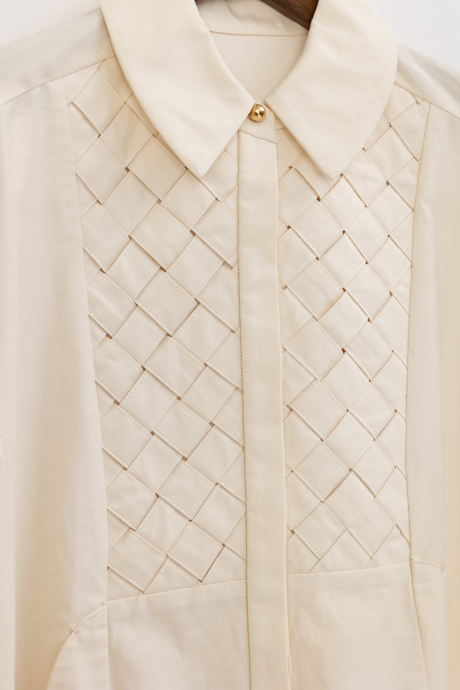 繊細に編み込まれた手編みのバスケット編みが、胸元に凛とした存在感を添えるシャツドレス。
