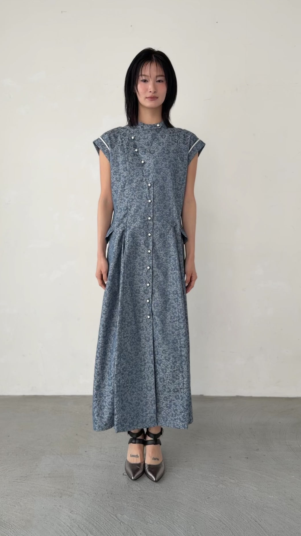 肩に寄り添う柔らかなライン、胸元から流れるように配したマーブル調のボタン。
