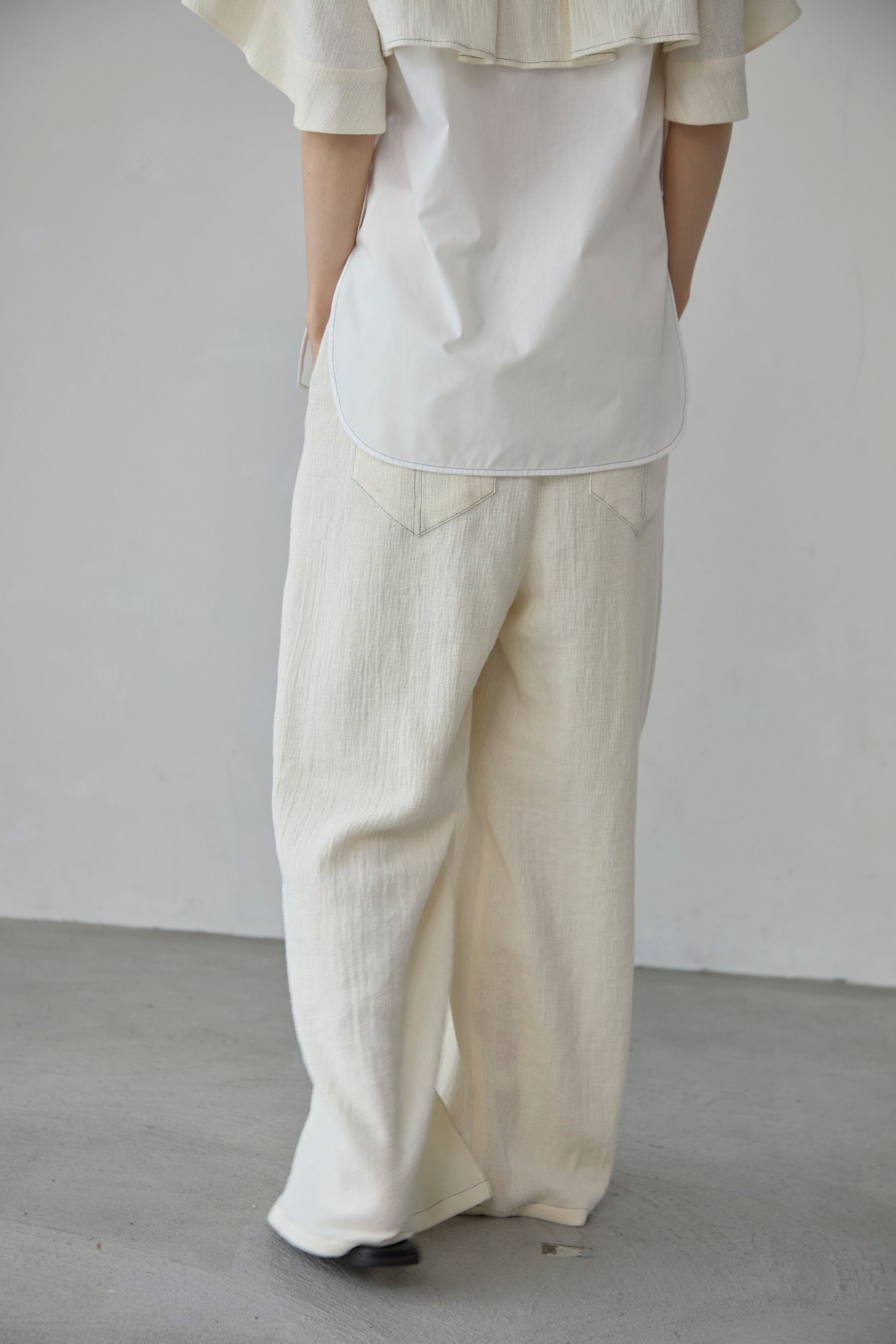 フロントに施したタックプリーツは脚線を拾いすぎず、まっすぐに落ちる美しいラインを描きます。