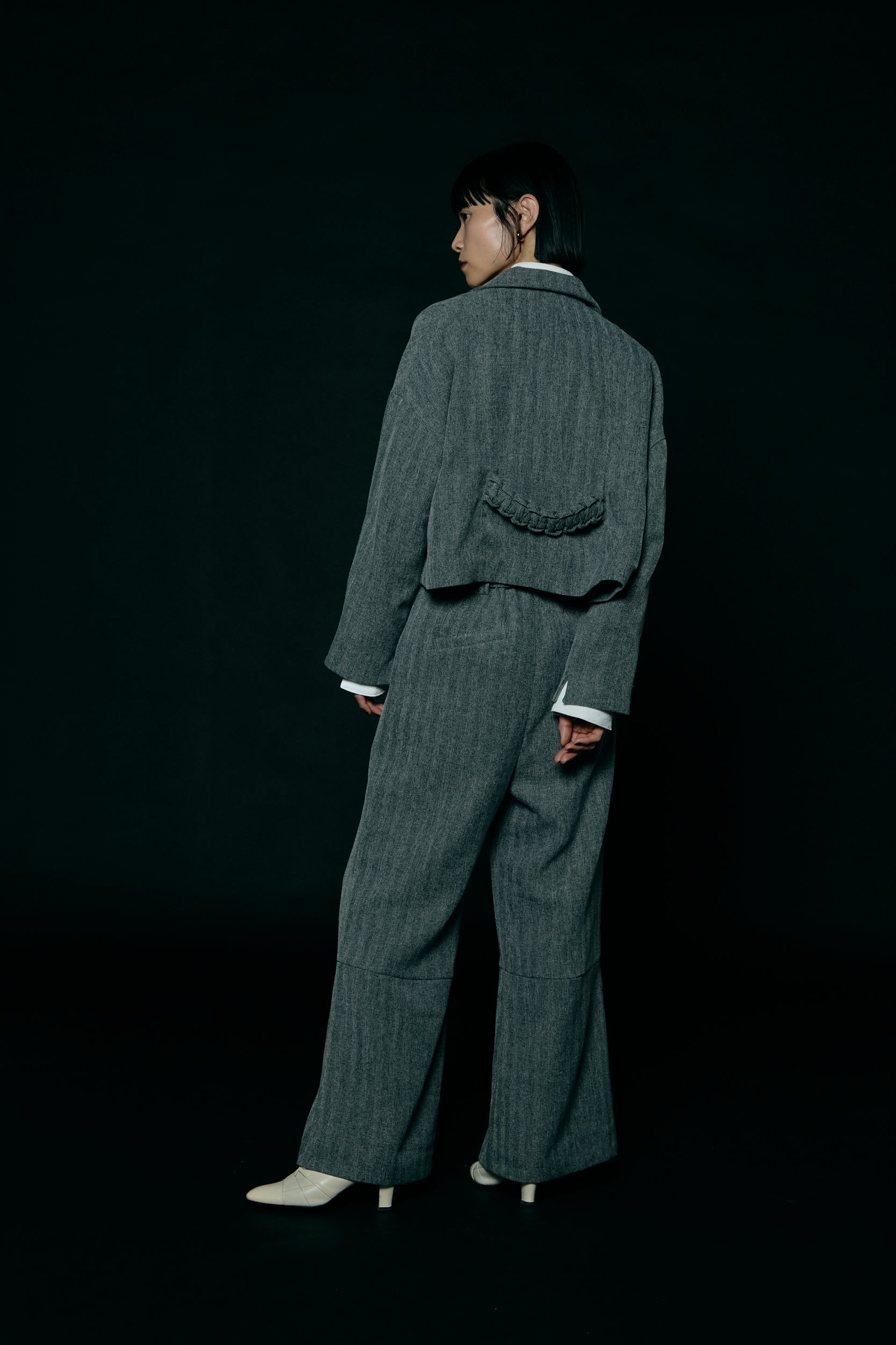 袖にはインパーデットプリーツをあしらい、セットアップで着用することで、静と動のバランスが際立たせる装いに。