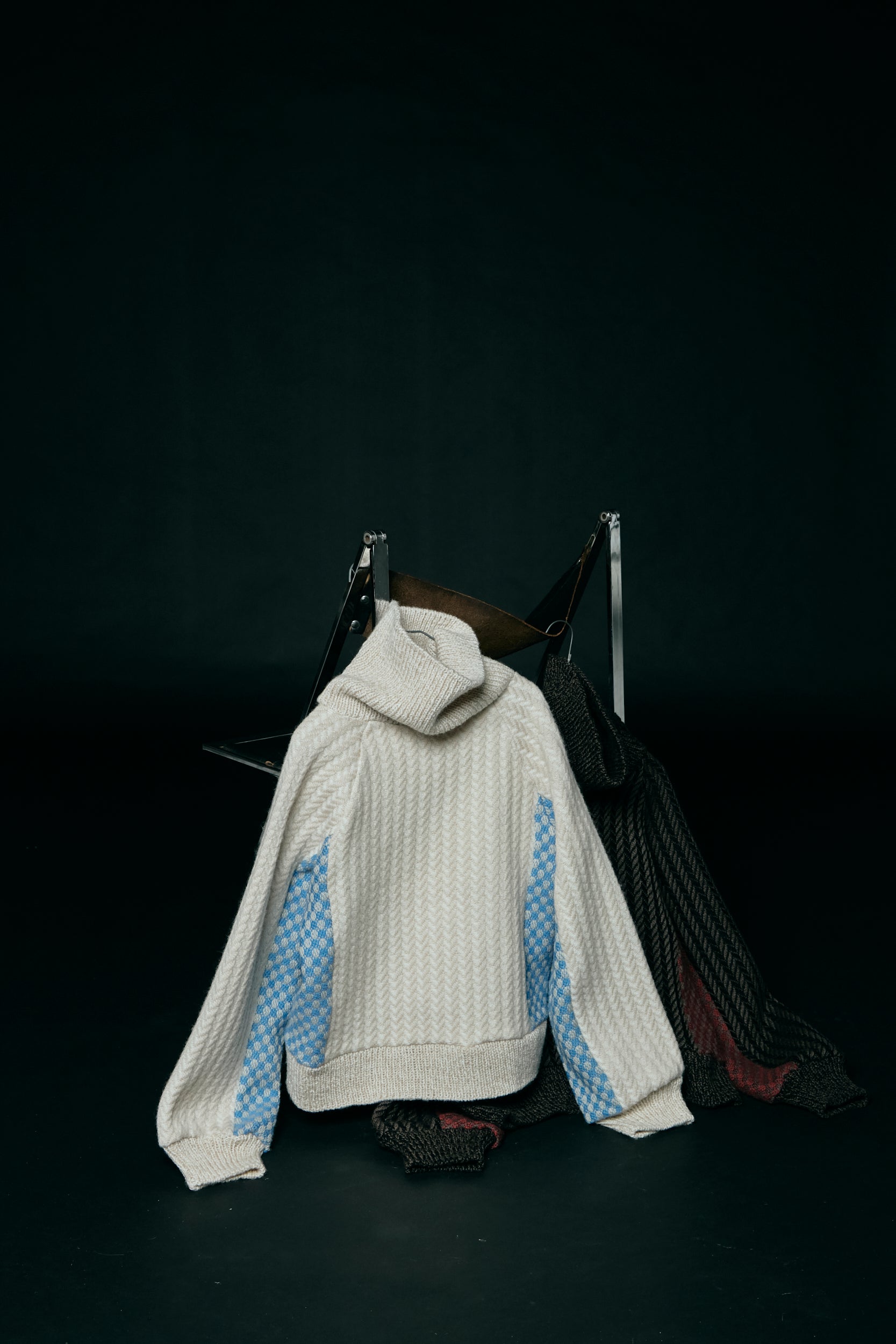 このテキスタイルに、手編みで仕立てられたリブを組み合わせることで、あたたかみと無骨さが同居する意匠に。