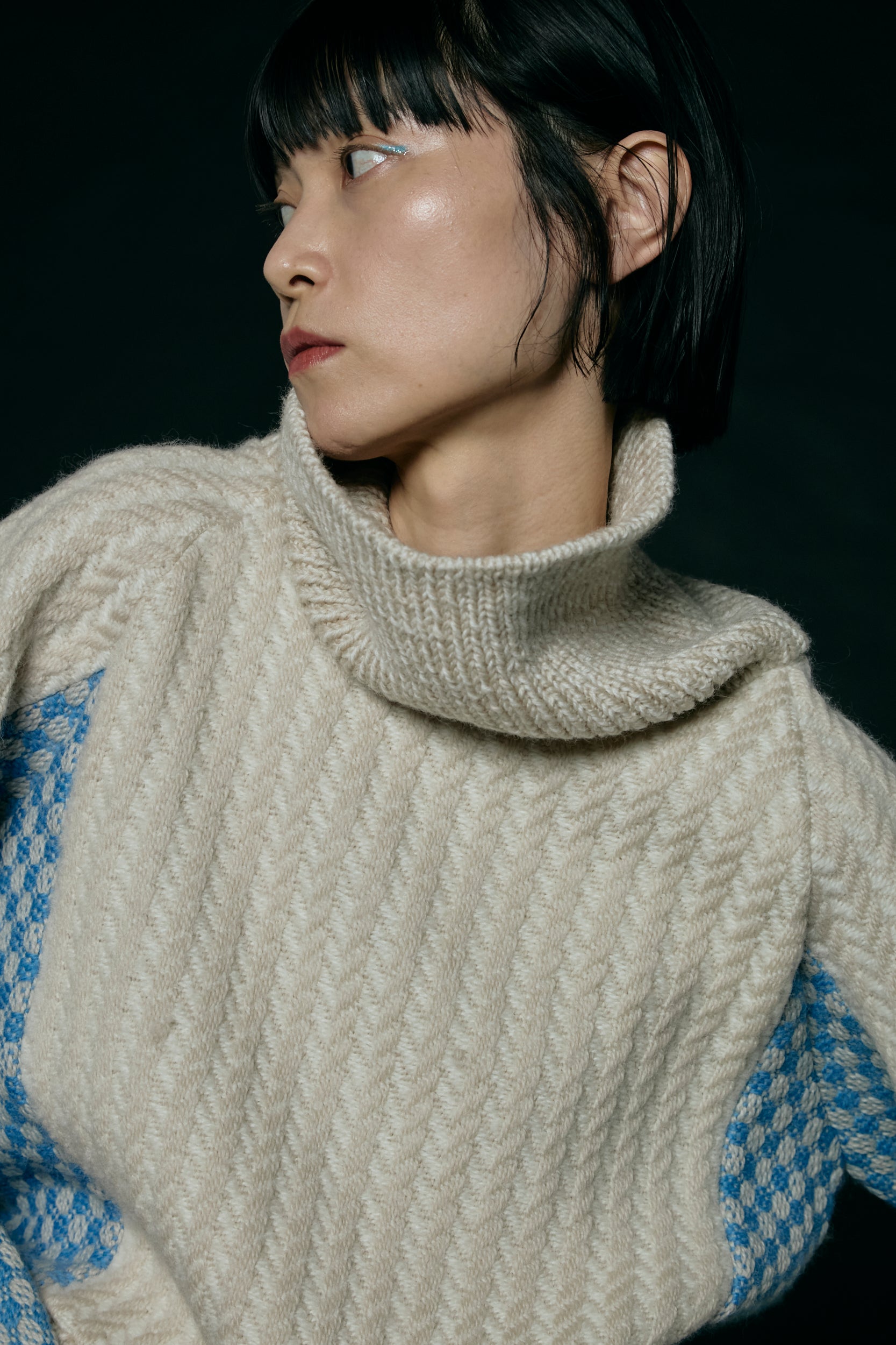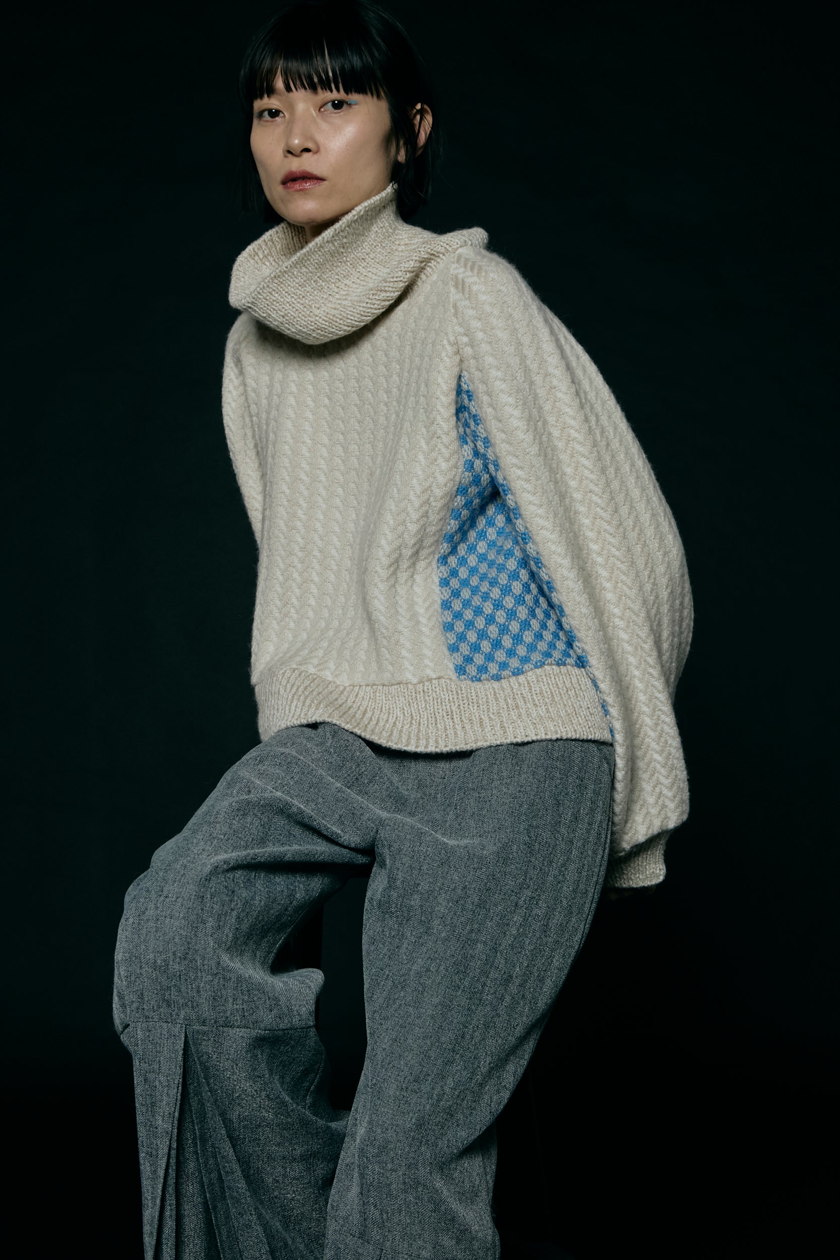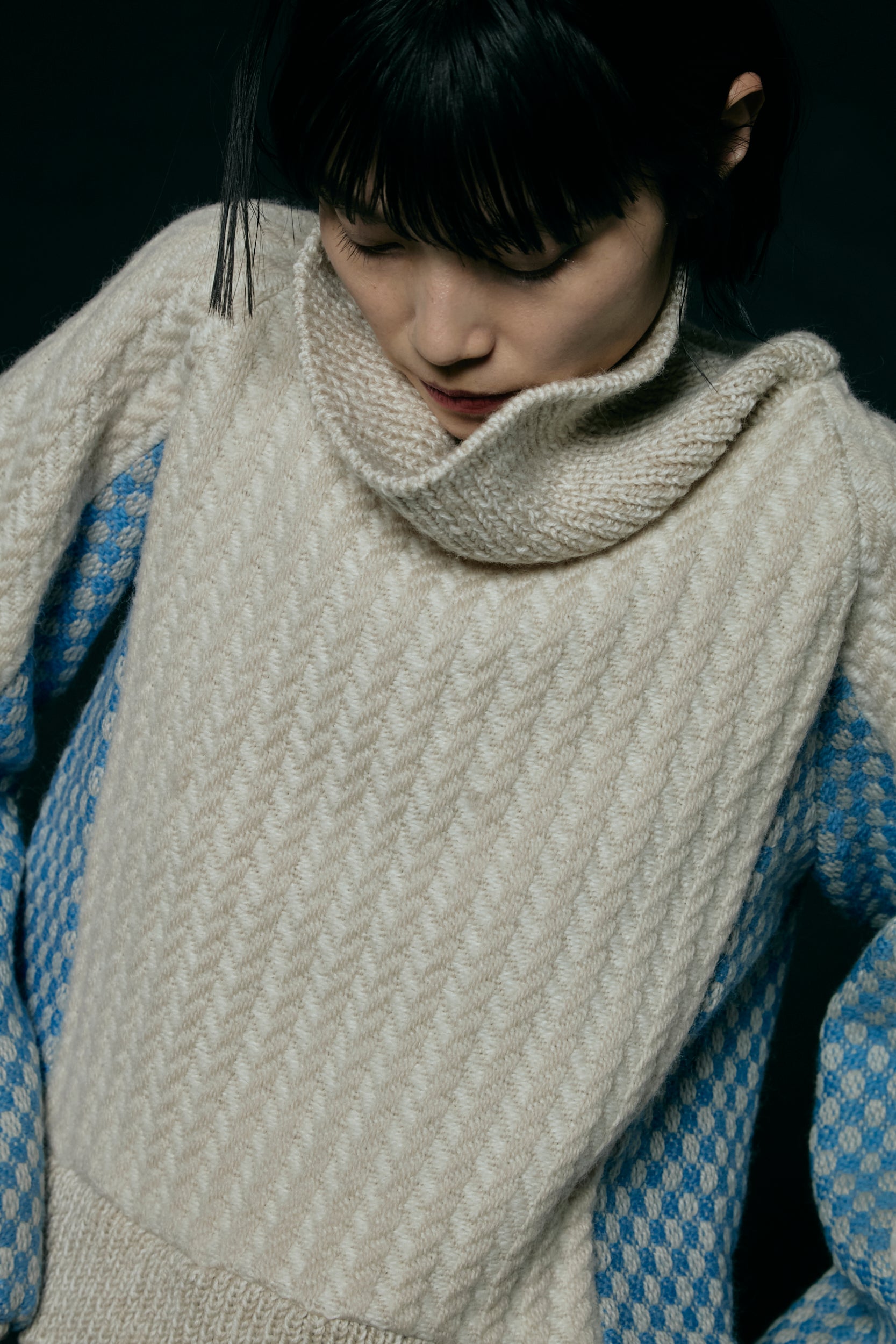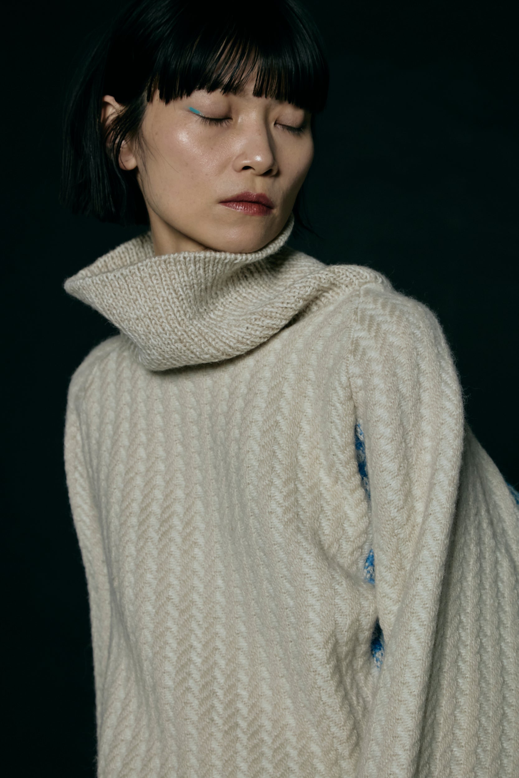 視覚と触感にささやかな裏切りを仕掛けるこのプルオーバーは、伝統と実験、手仕事と機械美が溶け合う、今季を象徴する一着です。
