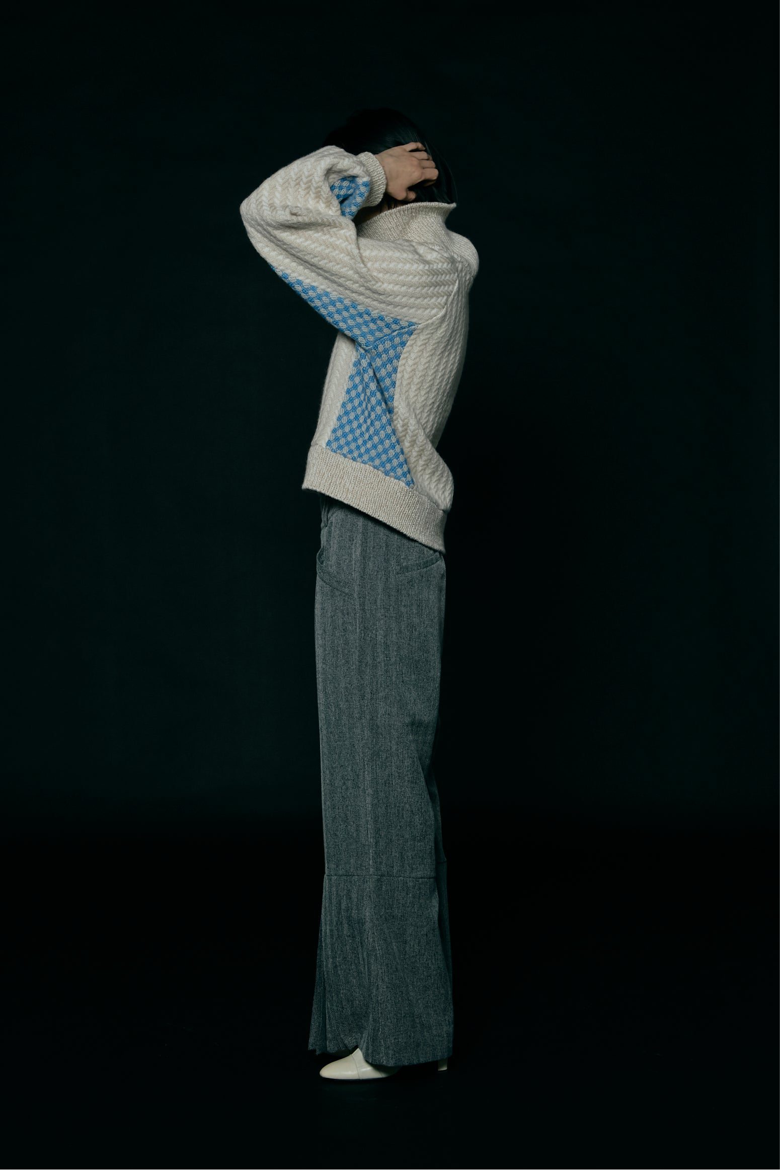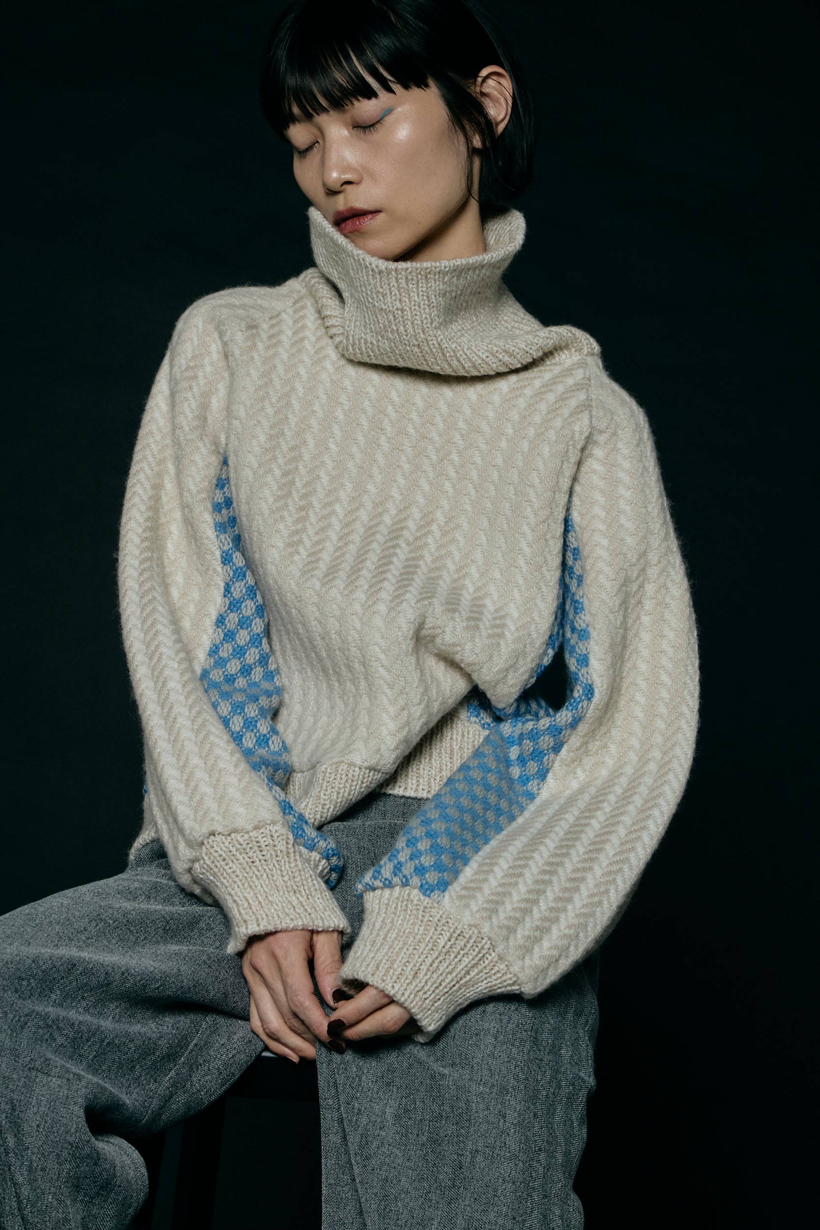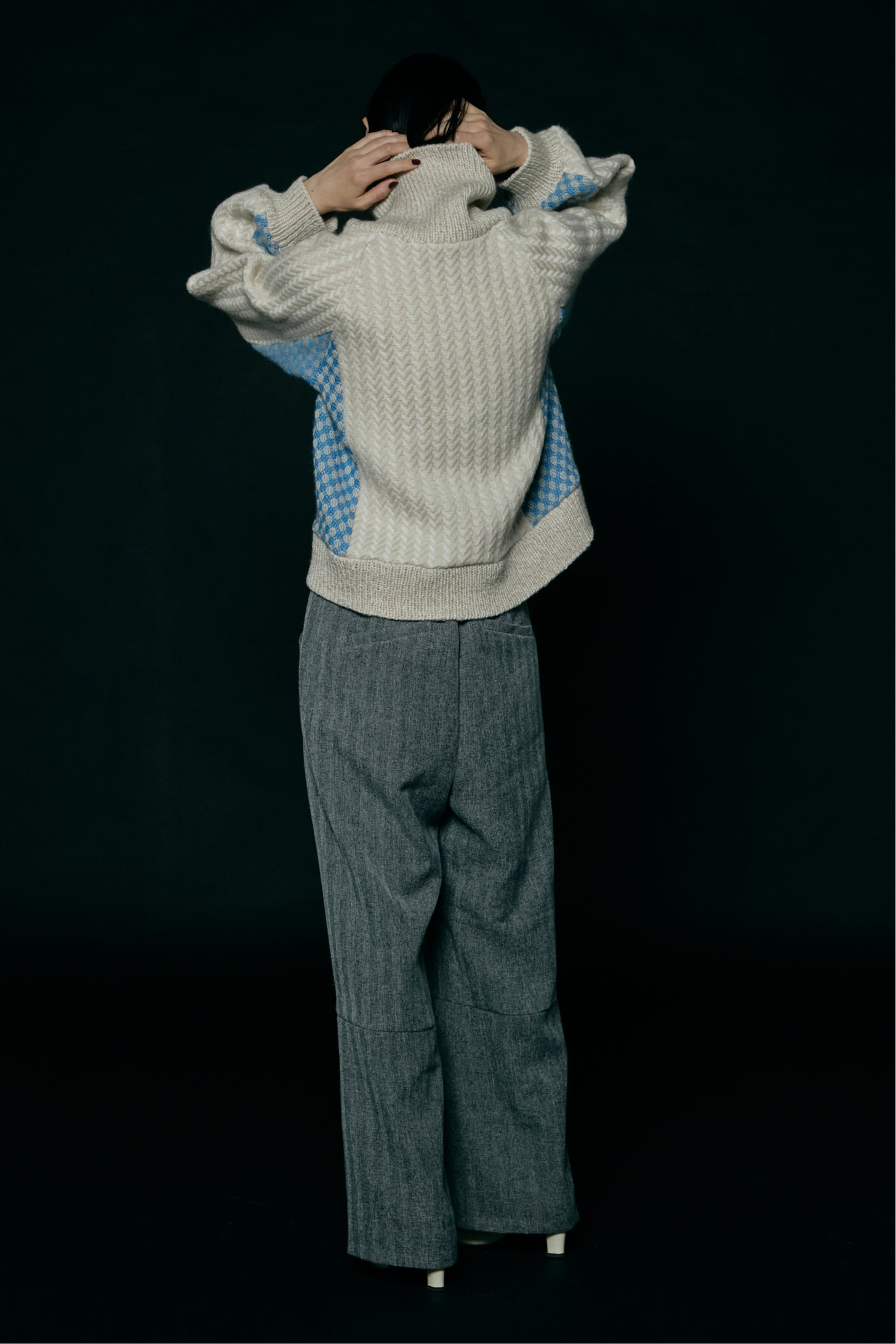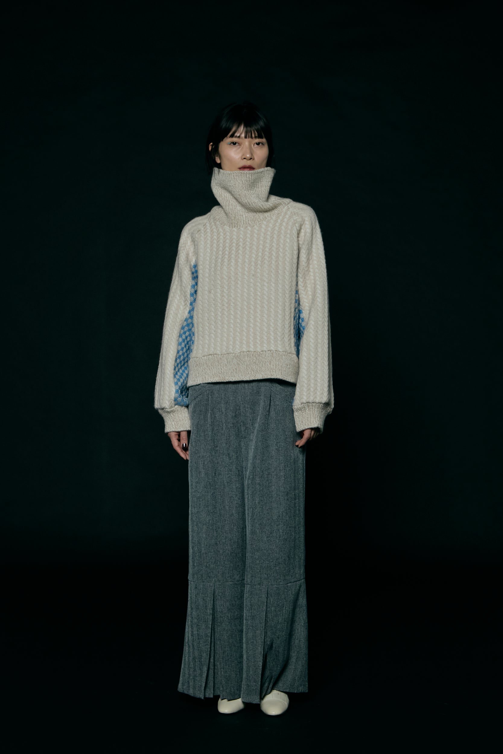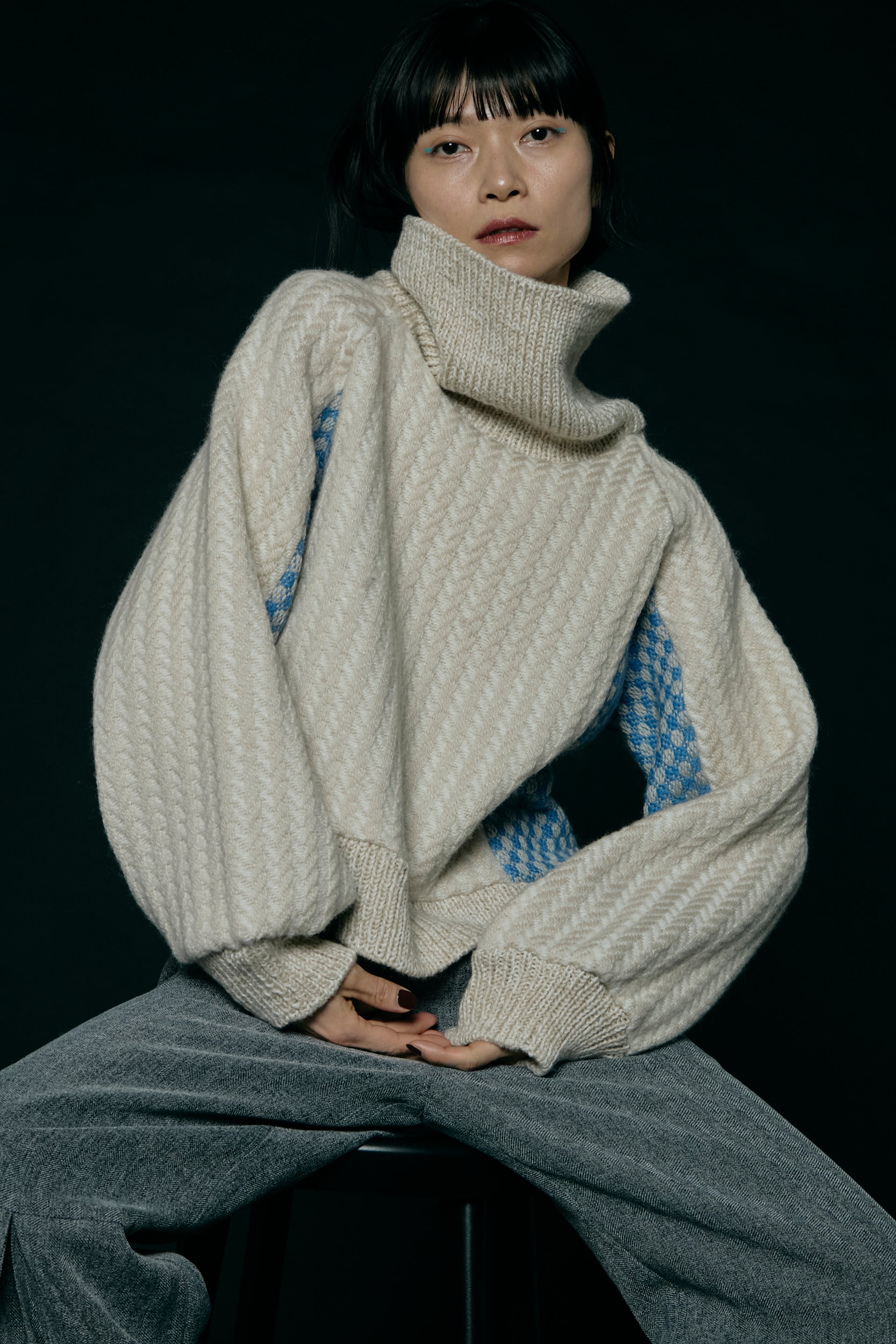 視覚と触感にささやかな裏切りを仕掛けるこのプルオーバーは、伝統と実験、手仕事と機械美が溶け合う、今季を象徴する一着です。