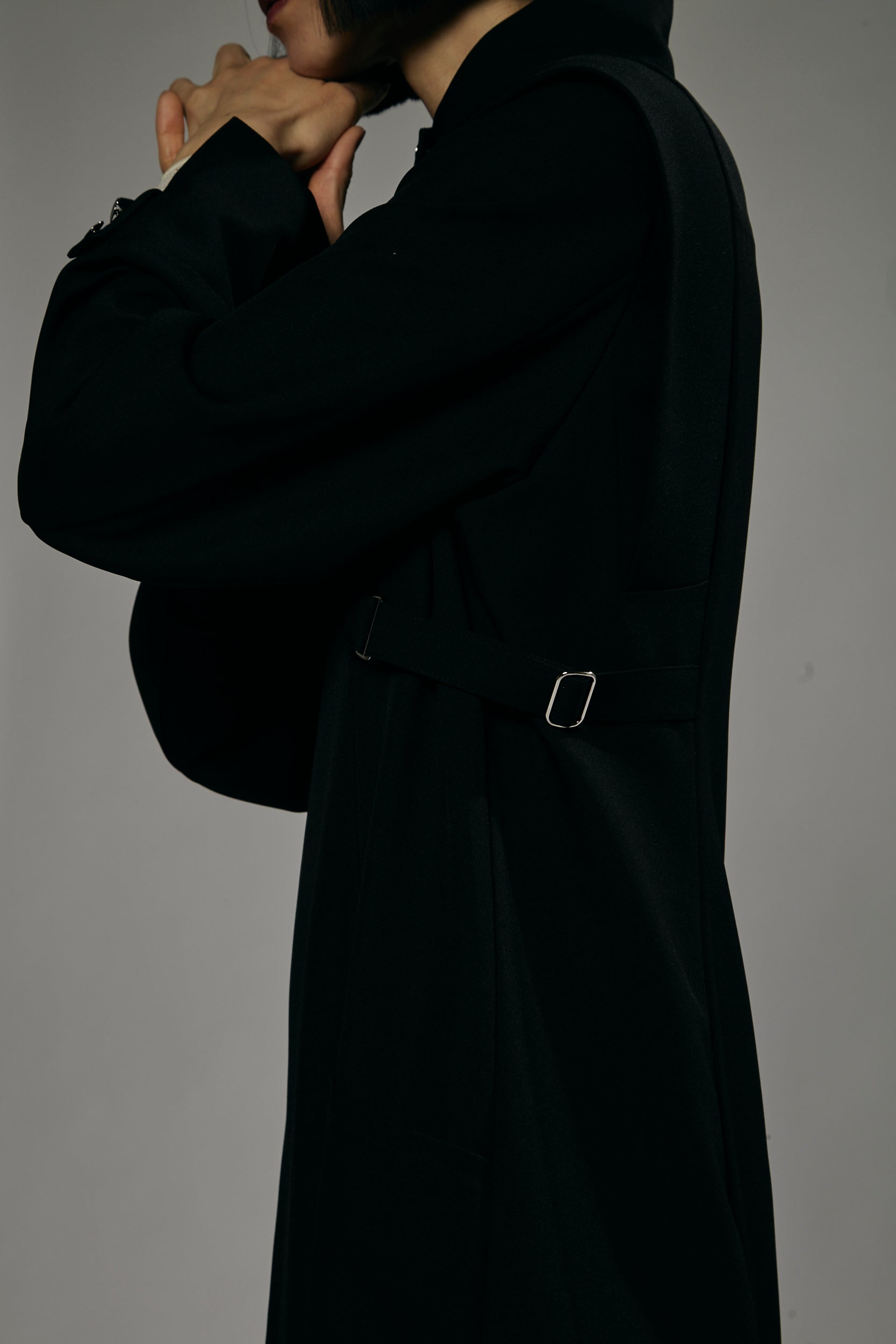 後ろファスナー開き、左右ポケットあり、左右アジャストベルト付き