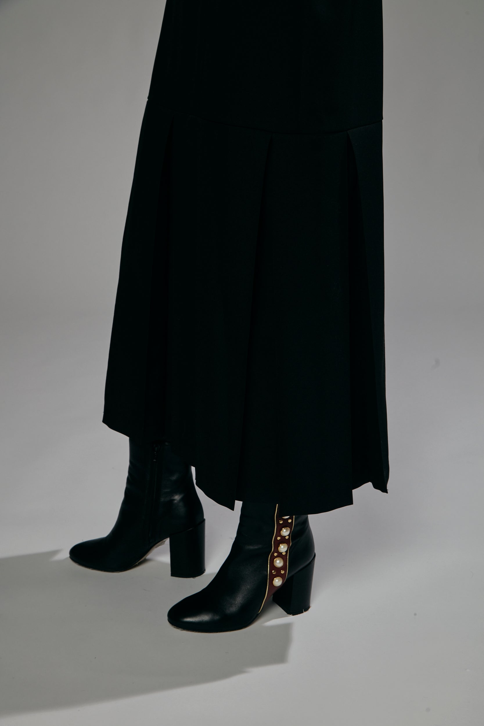 スカート部分には、職人の手織りによるプリーツ加工を施し、その美しいフォルムを保つために全ての折り山とヒダ奥をステッチで縫い止めました。