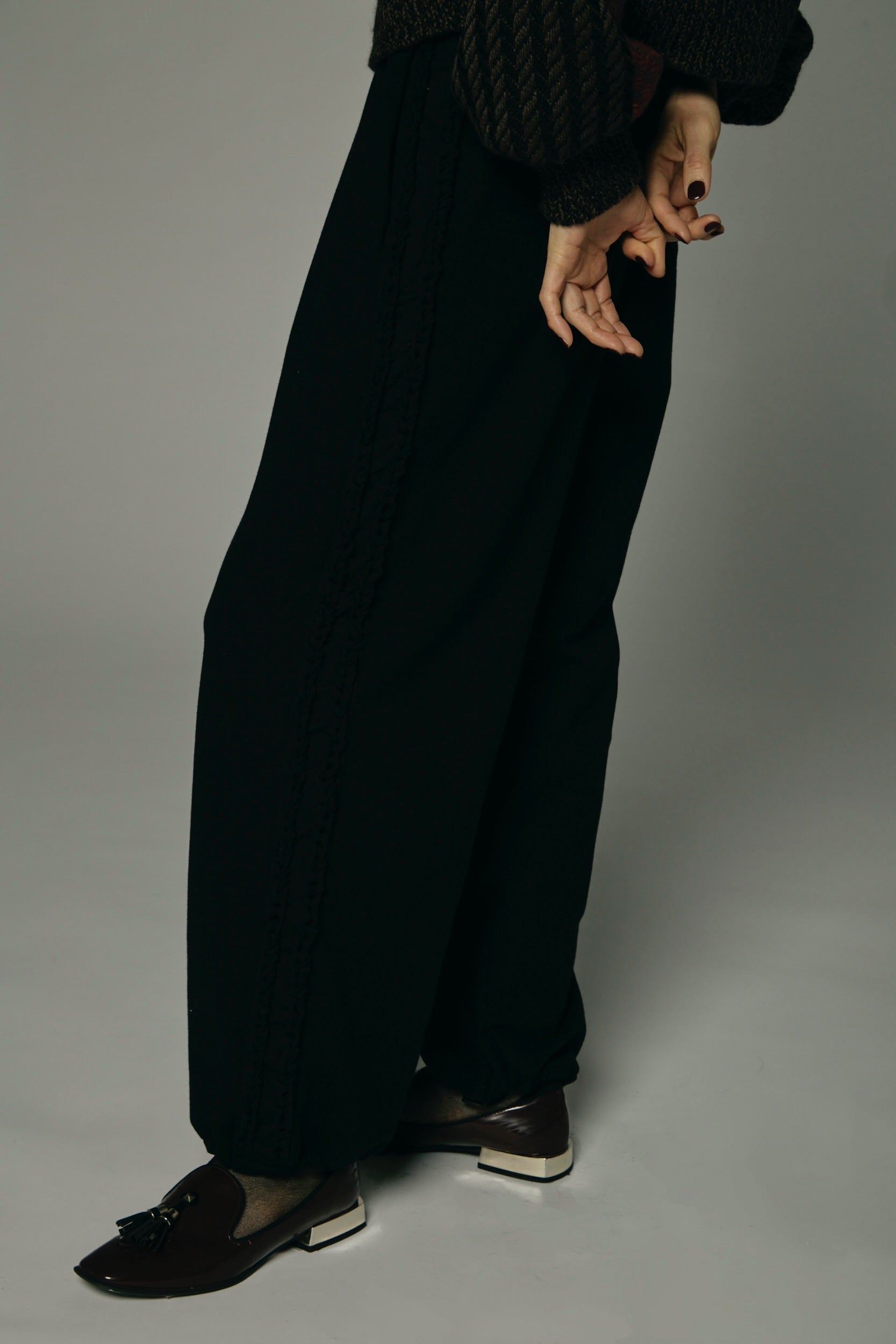 特殊なシルケット加工を施した上質なスウェット素材に、手編みによる引き抜き編みの装飾を両サイドにあしらった、クラフトマンシップの宿る一本。