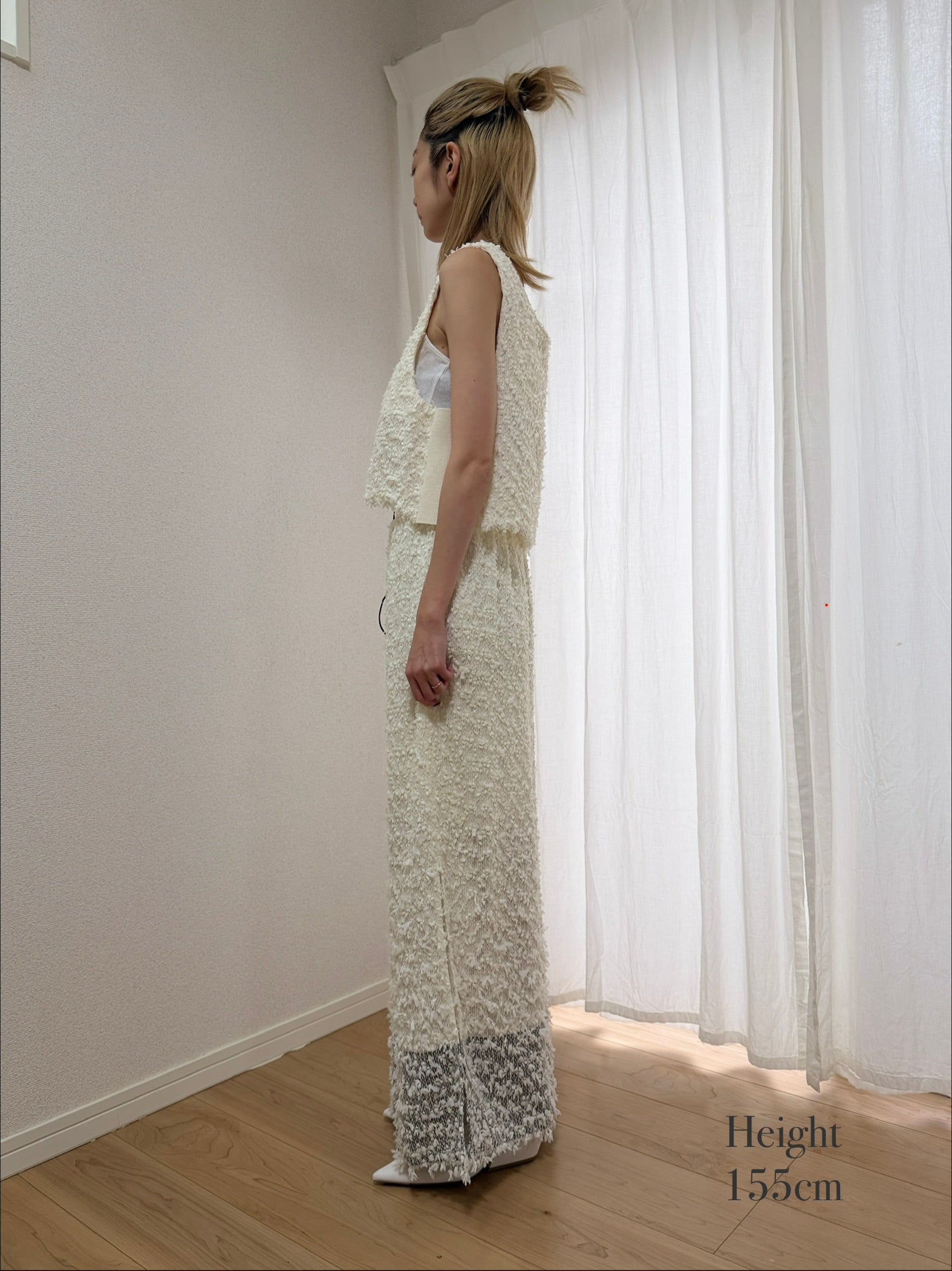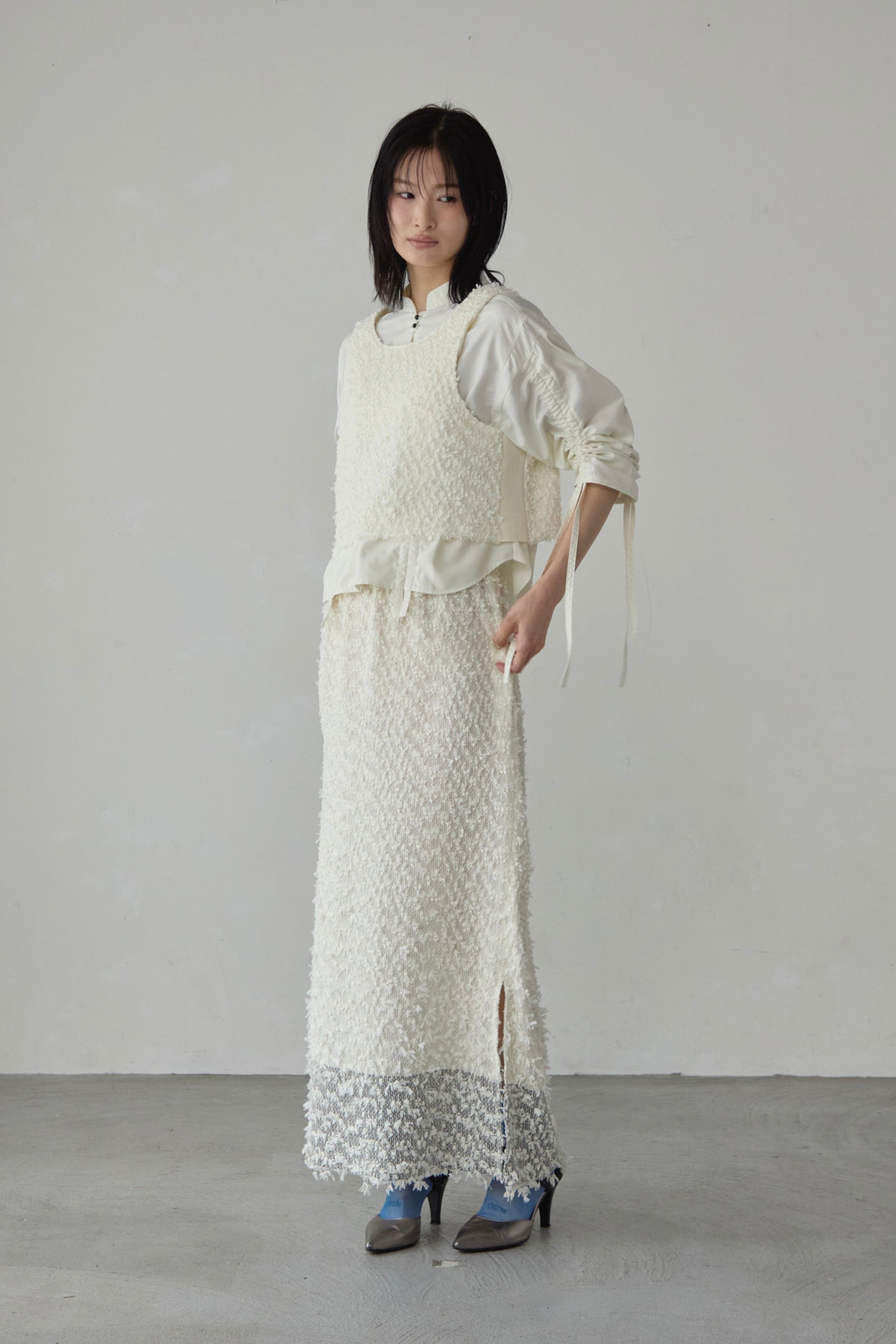 柔らかなウールに和紙を織り込むことで生まれた、細やかなリボン状のフリンジが、光を含みながら立体感を描き、装いに静かな華やぎを添えます。